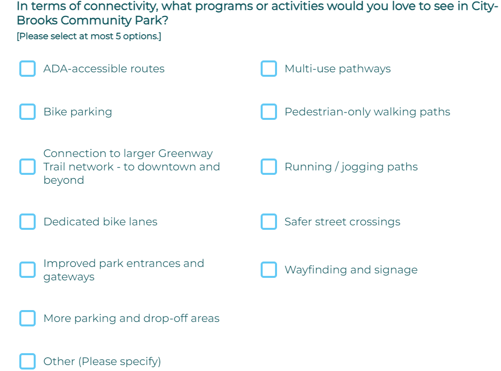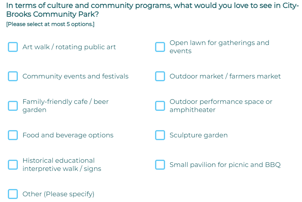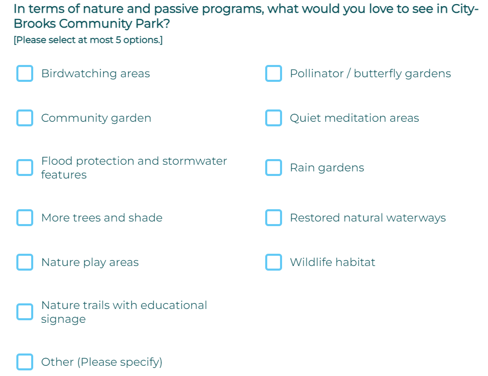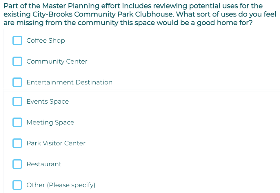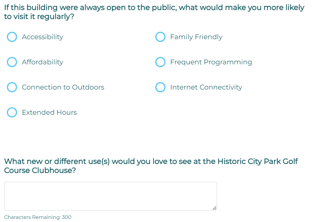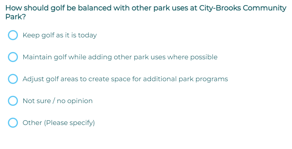 We ask that you AVOID selecting secondary 'program' use cases such as: handicap accessibilty (its the law already, we will press the issue), bike parking, jogging paths, car parking, safer street crossing, art exhibits, food, outdoor markets, etc, etc.... Every answer they list is a loaded trick. BREC know all these solutions, these items will be installed regardless of the survey response, BREC need to spend your $118M in tax money so they can justify a tax renewal. We ask you to leave all those choices blank. We promise to force BREC to add these items (goodies) outside of the golf footprint. We will post a demand for these program items outside of golf footprint. We will be your public advocate. Support us. BREC already knows these needs and is misleading and gas-lighting the public. We suggest SELECT ONLY "OTHER" checkbox and the write-in "Maximize golf footprint. Save our golf course 100% complete. Give the pulic options to improve golf resources. Don't give us crumbs and cake."