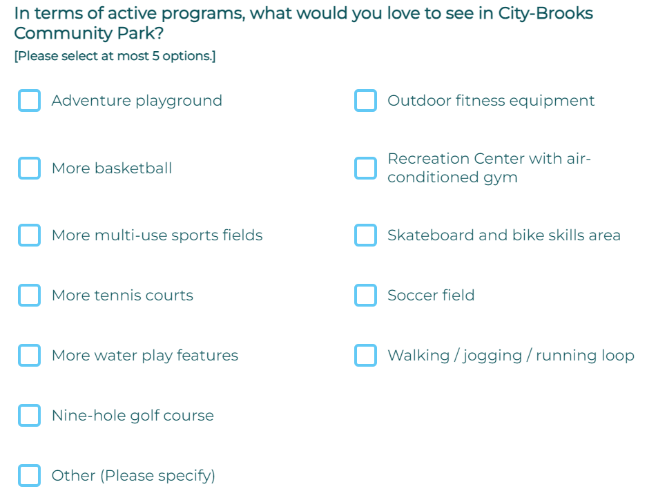 All of the survey questions deploy a common bias strategy. They often exclude golf from the selection process. They ask for five choices when only one choice can be golf. Thus completing four non-golf items allows a narrative. The biased consultants and BREC will claim, citizens are asking for many 'program uses' beyond golf and the only solution is to close or eliminate golf to make physical space for these new 'programed uses' or even 'quiet/nature uses'. The point is, these secondary uses can occur elsewhere in the greater park footprint. BREC knows exactly what they are. They are listing them for you. No matter how you try, BREC will twist the answer to tell the public the golf course must be closed.